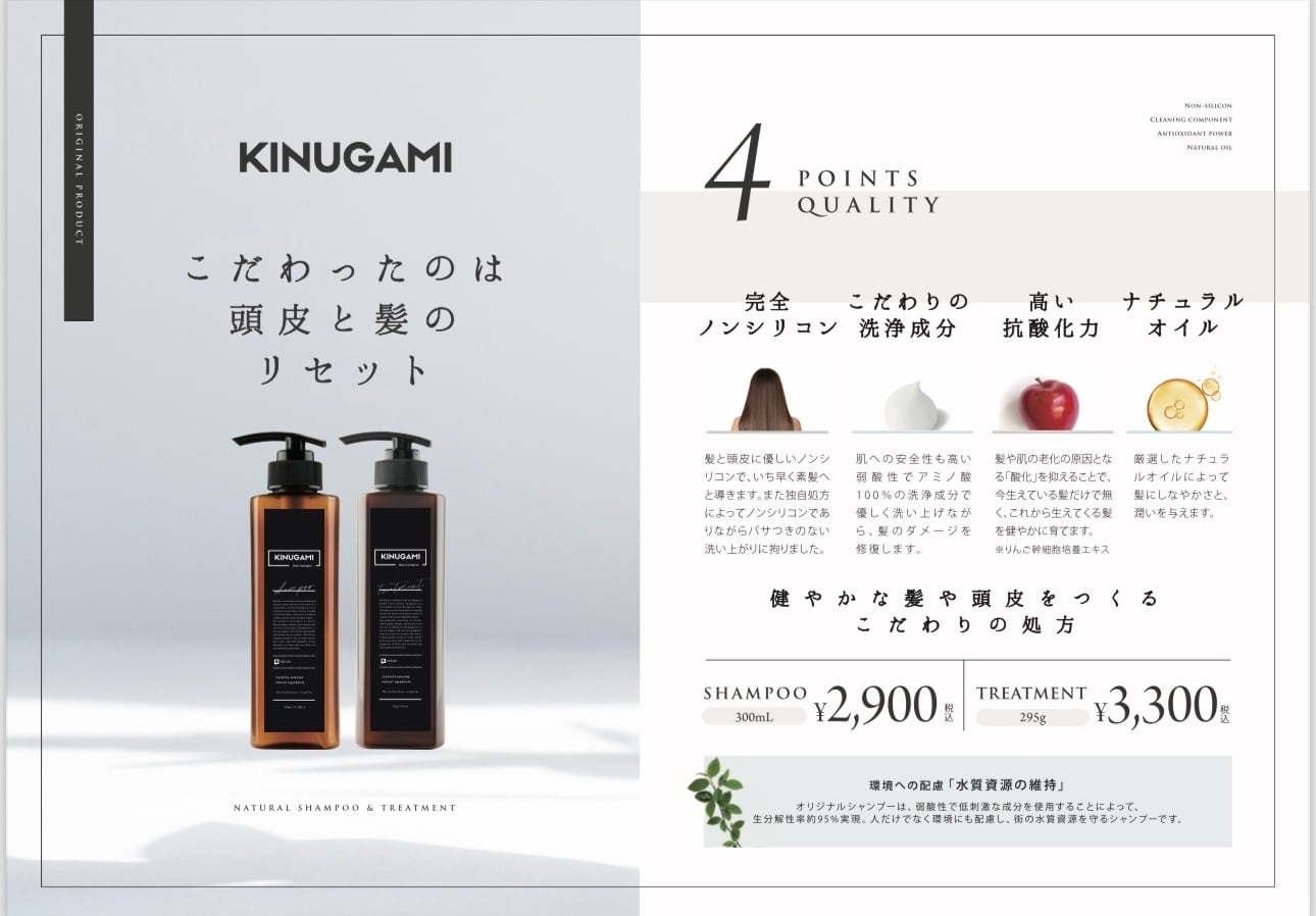 KINUGAMI シャンプー&トリートメントのセットは、髪の毛の悩みを解決したい方にぴったりです。日々のヘアケアを通じて、あなたの美しさを引き出しましょう。